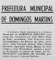 Foi eleito Paulo Lorenzoni para prefeito. Não tivemos vereadores eleito. Mas foi no seu mandato que a vila de Marechal Floriano teve grandes obras. Uma delas era o sistema de abastecimento de água. Tínhamos somente uma caixa de pequeno porte, situada num terreno da família Pereira, na atual rua Emílio Endlich. Eram poucas residências que tinham água encanada. Usava-se muito água do rio Braço do Sul e o córrego Batatal. Para beber, a vila tinha inúmeras nascentes, inclusive dentro da vila. O encanamento além de velho, era de pequena polegada. Uma parte do encanamento ficava ao lado do rio. Quando tínhamos enchente, era uma falta d'água tremenda. Na ocasião o bombeiro da prefeitura era José Henrique Pereira ( José Piaba). Vivia dentro do rio consertando cano. Foram colocados canos de maior polegada nas principais ruas. Foi construída uma nova caixa d'água, numa nascente pertencente ao Sr. Waldemar Mees. No final do seu mandato construiu um local para venda de carnes abatidas, situado ao lado da Serraria Santana. Este açougue funcionou até os anos setenta. Na inauguração deste açougue, a prefeitura proporcionou uma grande festa com churrasco e bebidas. O primeiro açougueiro deste local foi Ormindo Endlich. TER – ES – Jair Littig.